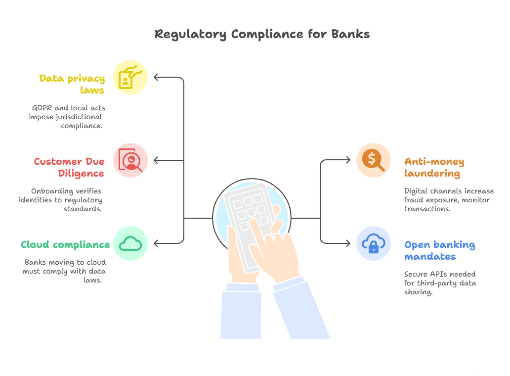 Modern banks must navigate an expanding web of regulatory requirements. Key areas of concern include: